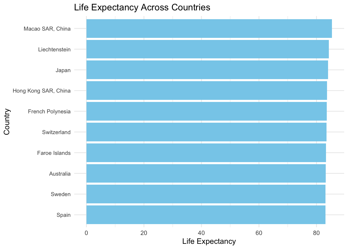 # Summary statistics of life expectancylifex_clean |>summarise(avg =mean(life_expectancy, na.rm =TRUE),median =median(life_expectancy, na.rm =TRUE),min =min(life_expectancy, na.rm =TRUE),max =max(life_expectancy, na.rm =TRUE) )